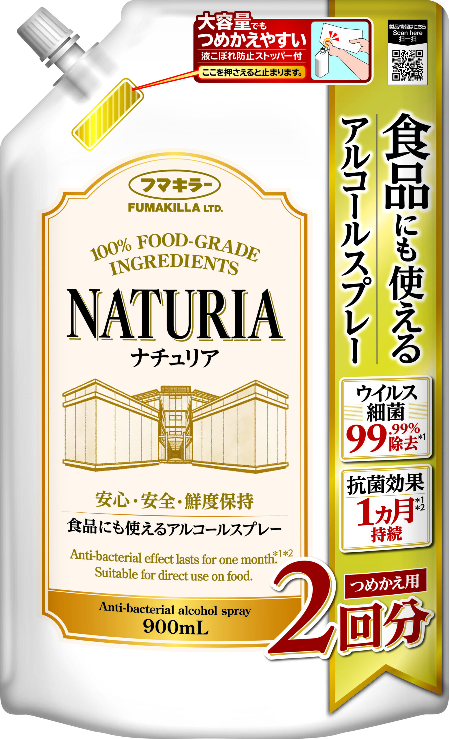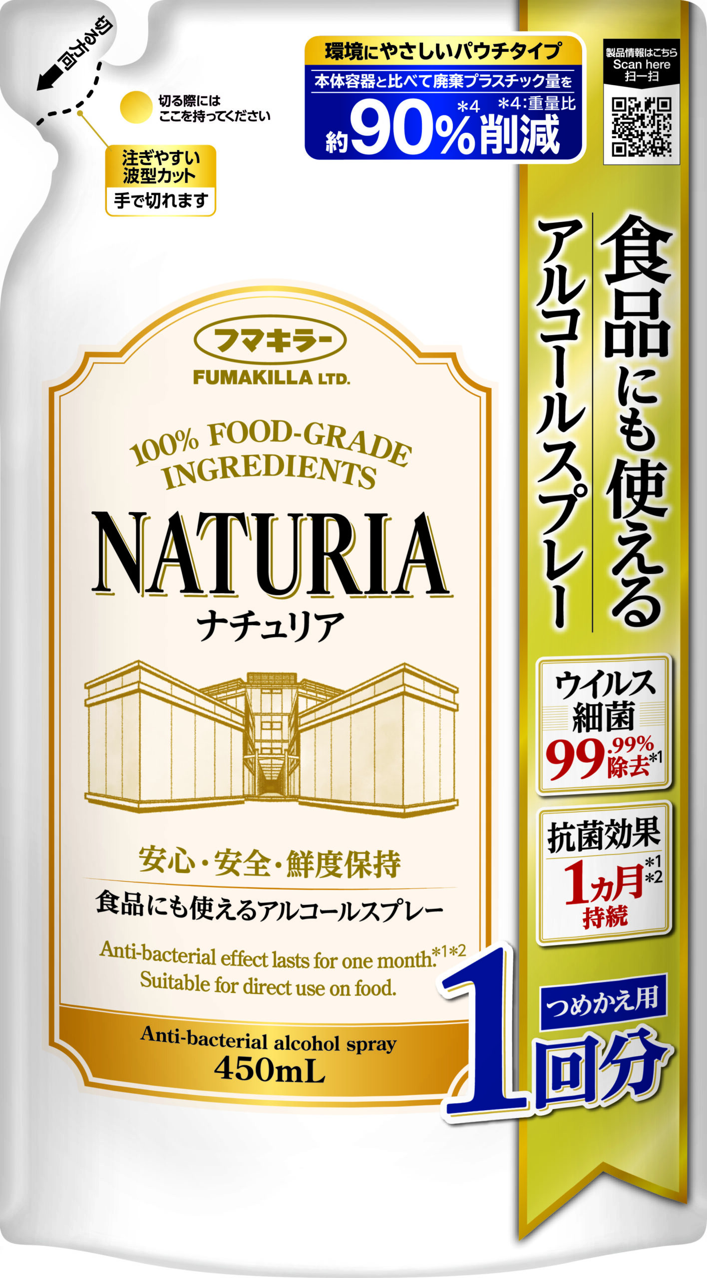 「食品にも使えるアルコールスプレー ナチュリア」は、スプレーするだけで細菌・ウイルスを99.99%除去*1。さらに天然抗菌成分GSE(グレープフルーツ種子エキス)が対象物の表面に留まり、抗菌効果が1ヵ月*1*2持続します。天然生まれの食品成分のみでできているので、いろいろな場所で使え、食品にも直接使用できます。またパッチテスト済みでお肌に触れても安心*3。