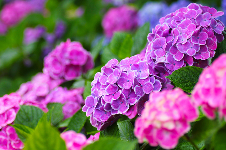 開花期は、5月から7月。白、青、紫、赤などの花色があります。日本ではとても身近な植物のひとつで梅雨から花を咲かせます。土の酸性度合いによって花色が変わる性質があり、挿し木などでも増やすことができます。