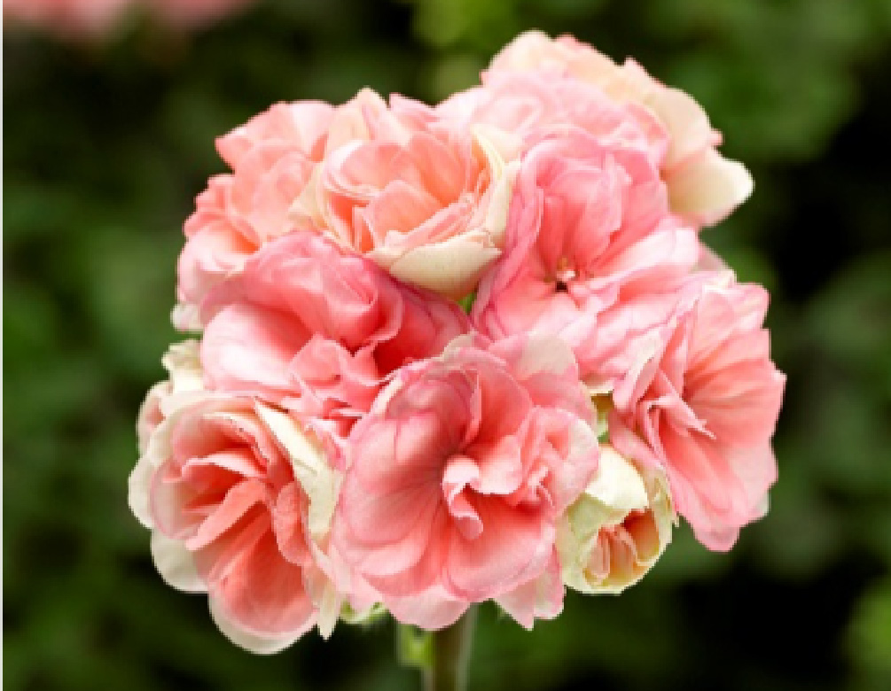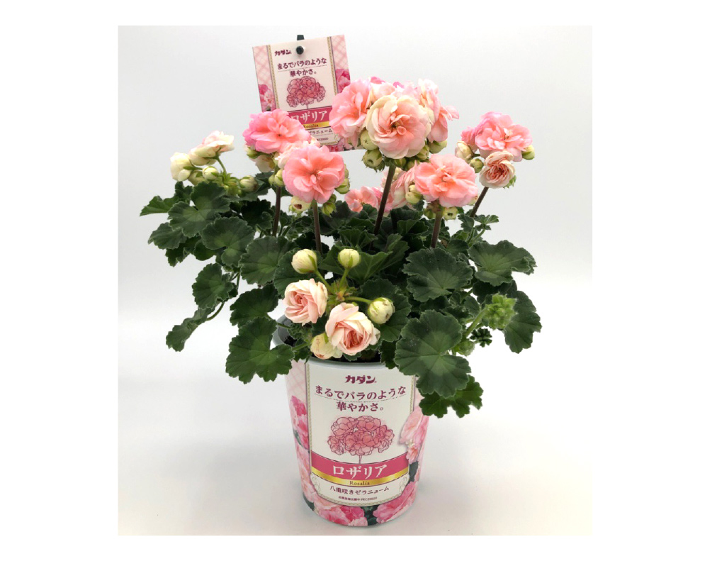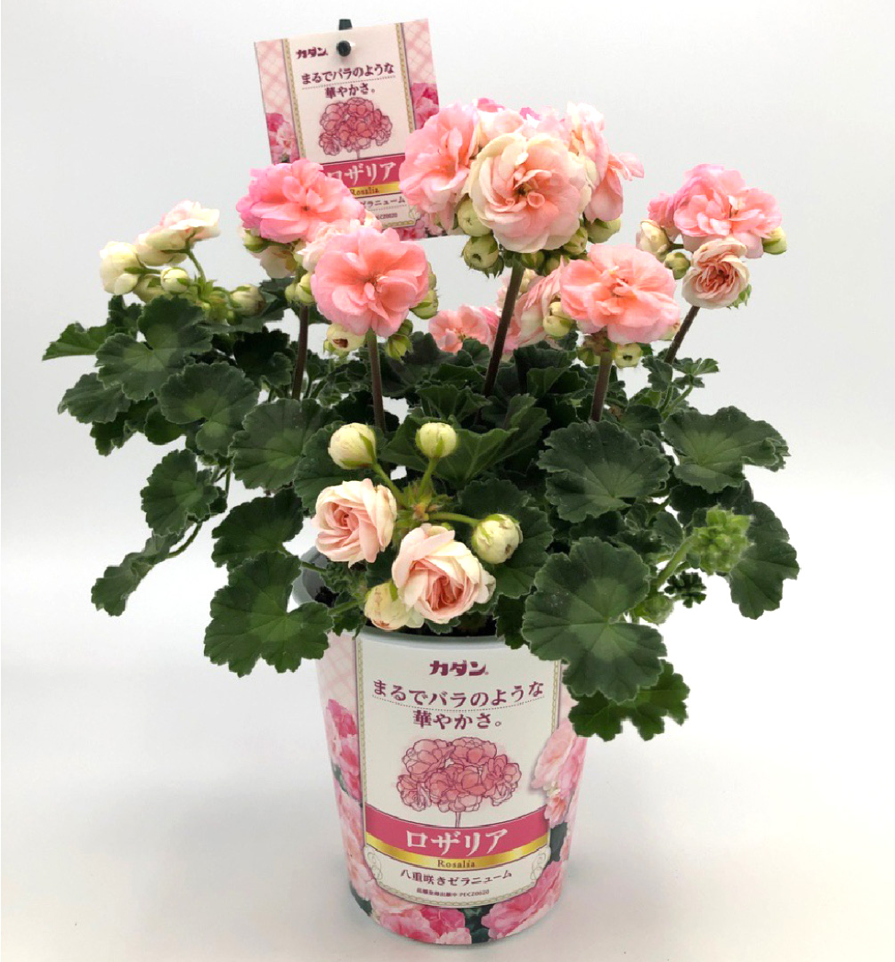 ロザリアは、まるでバラのような豪華な八重咲きが非常に美しいゼラニウムです。春先にクリーム色からソフトピンクへ移ろう蕾状の花がかわいらしく、通常のゼラニウムと違って花びらが散りにくいのが特徴。次々と蕾をつけて連続的に開花します。