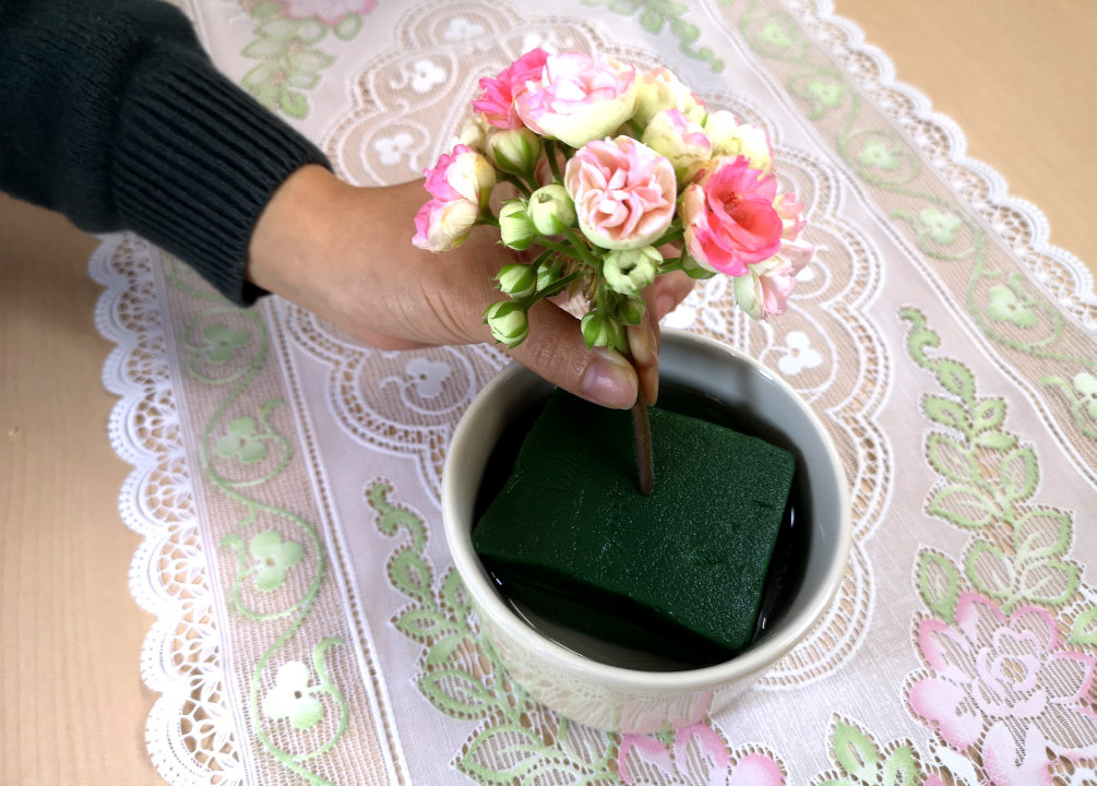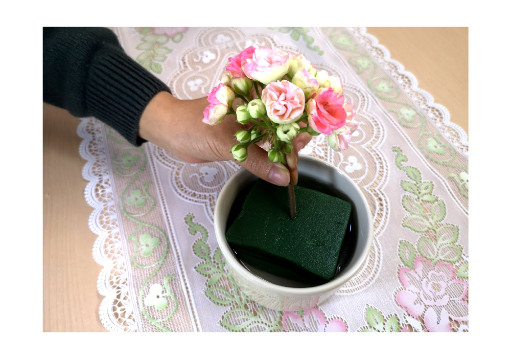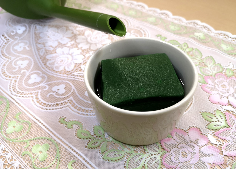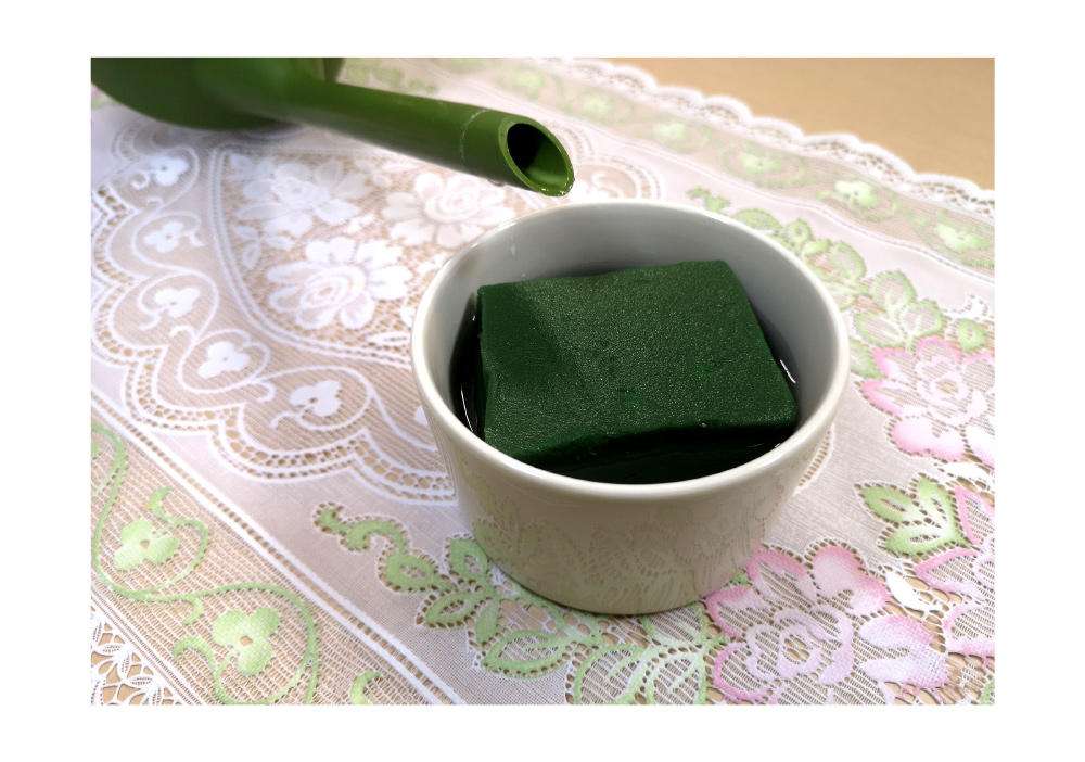 ①やや浅めの器にフローラルフォーム(生花吸水スポンジ)をちょうどよい大きさに切って入れ、十分に水を含ませます。